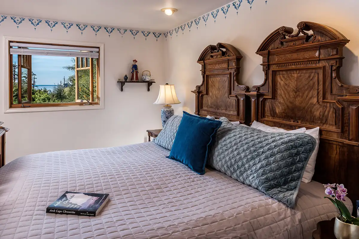 Indulge in a romantic getaway at our exquisite bed and breakfast near Cannon Beach, Oregon. Immerse yourself in the charm of the Tower Room, where you can awaken to a breathtaking view of the ocean right from your window. This magnificent room, located on the top floor of our inn, boasts a refined ambiance adorned with exquisite Louis XVI furniture.